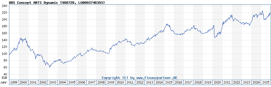 Anlagestrategie: Ziel der Anlagepolitik ist die Erwirtschaftung eines positiven Anlageergebnisses. Um dies zu erreichen, investiert der DWS Concept ARTS Dynamic weltweit überwiegend in gruppeneigene Fonds der Verwaltungsgesellschaft (inklusive Exchange Traded Funds). Der Fonds kann darüber hinaus auch in Fonds mit alternativen Investments (z.B. Fonds auf Rohstoffe und Rohstoffindizes) anlegen. Je nach Marktlage kann der Fonds auch vollständig in Aktienfonds, Rentenfonds, geldmarktnahe Fonds, Währungsfonds, Exchange Traded Funds oder in Fonds auf Finanzindizes investiert sein.