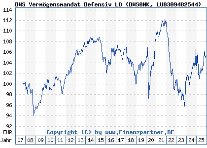 Anlagestrategie: Der DWS Vermögensmandat Defensiv LD investiert je nach Börsensituation flexibel in Einzelwerte, Fonds und Zertifikate/Derivate auf überwiegend europäischer Basis. Mindestens 70% des Fondsvermögens werden dabei in wertstabilen Anlageformen (z.B. Staatsanleihen) angelegt. Der Fonds strebt eine über Geldmarkt liegende Zielrendite an. Je nach Marktlage werden bis zu 30% des Fondsvermögens in chancenreiche Anlageformen investiert.