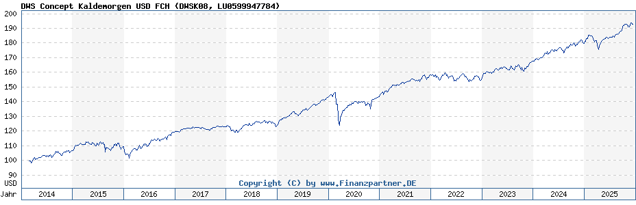 Anlagestrategie: Anlageziel des DWS Concept Kaldemorgen USD FCH ist ein Kapitalzuwachs. Hierzu investiert der DWS Concept Kaldemorgen USD FCH bis zu 100% seines Vermögens in Aktien, Anleihen, Zertifikate, Geldmarktinstrumente und Barmittel. Der Fonds wird abhängig vom allgemeinen Konjunkturzyklus und der Einschätzung des Fondsmanagements in unterschiedlichen Märkten und Instrumenten anlegen. Bis zu 20% dürfen in forderungsbesicherte Wertpapiere investiert werden. Bei der Auswahl der Anlagen werden neben dem finanziellen Erfolg ökologische und soziale Gesichtspunkte und die Grundsätze einer guten Corporate Governance (sogenannte ESG-Faktoren) berücksichtigt.