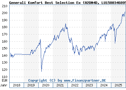 Anlagestrategie: Anlageziel des Generali Komfort Best Selection Ex ist maximales Wachstum. Der Generali Komfort Best Selection Ex investiert in Aktien- und Anleihenstrategien mittels Fonds und ETFs. Angelegt werden kann auch in Fonds und ETFs, die eine Multi-Asset-Strategie verfolgen. Der Investitionsschwerpunkt liegt dabei auf den Aktienmärkten (auch durch Fonds und ETFs). Der Fonds wurde am 19.01.2018 infolge der Zusammenlegung durch Übernahme des Fonds LU0801918474 aufgelegt. Der neu aufgelegte Fonds weist dieselben Eigenschaften, insbesondere im Hinblick auf die Anlagepolitik auf.