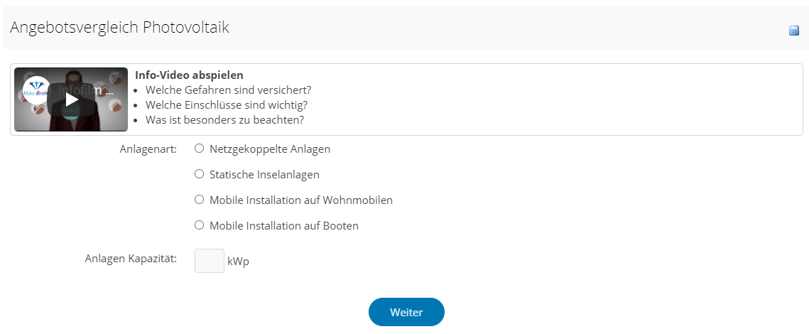 Achtung: Der Photovoltaik Versicherungs Vergleich kann erst benutzt werden, wenn Sie das Lesen der Erstinformation bestätigen!