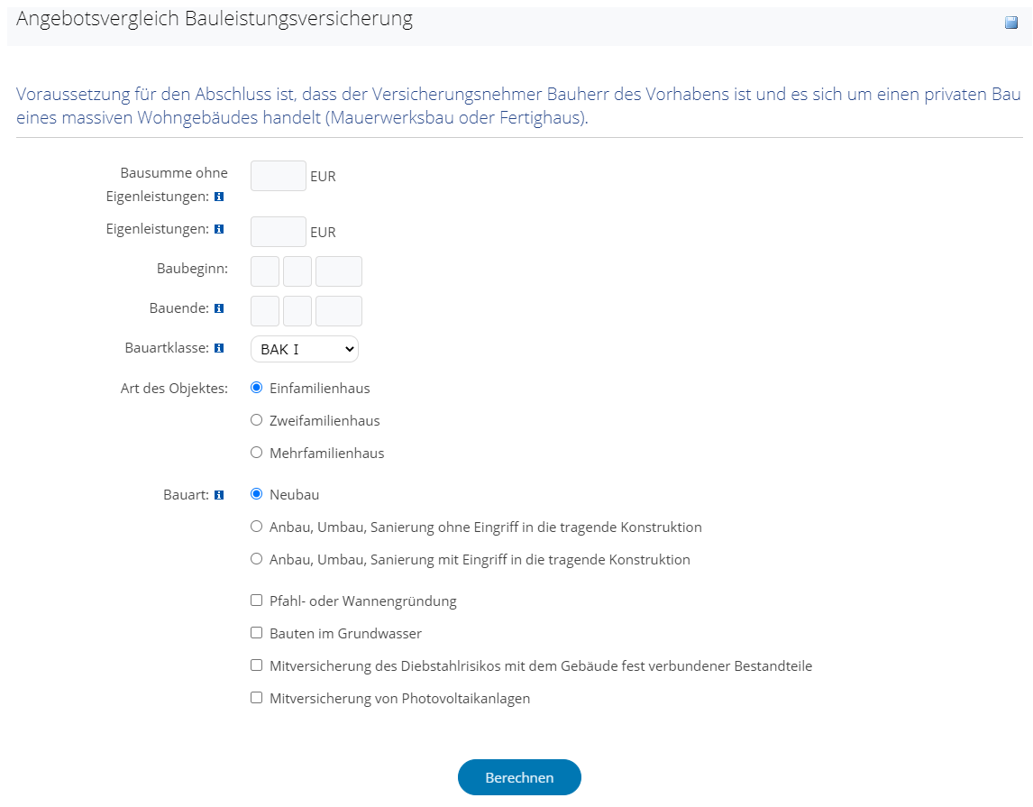 Preisvergleich: Der Rechner erstellt nach Ihren Vorgaben einen individuellen Versicherungsvergleich der Kosten einer Bauleistungsversicherung.