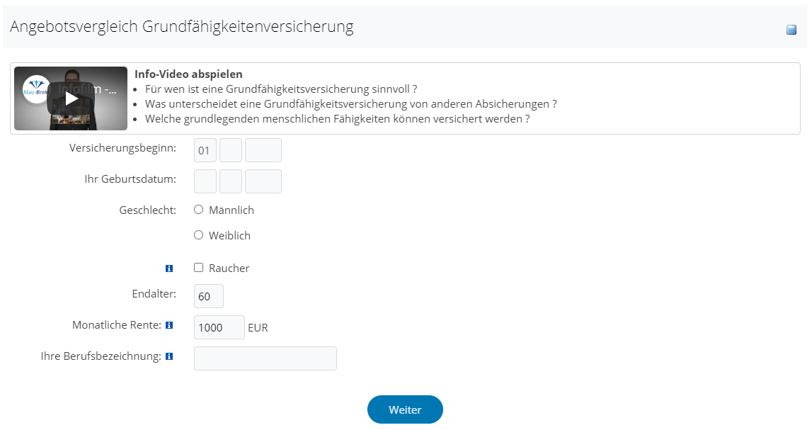 Preisvergleich: Der Rechner erstellt nach Ihren Vorgaben einen individuellen Versicherungsvergleich der Kosten einer Grundfähigkeiten Versicherung.