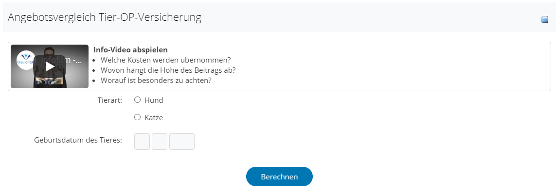 Preisvergleich: Der Rechner erstellt nach Ihren Vorgaben einen individuellen Versicherungsvergleich der Kosten einer Tier OP Versicherung.